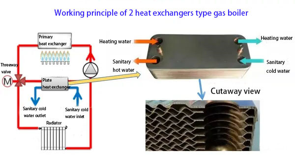 De platenwarmtewisselaar-gascombiketel heeft twee warmtewisselaars: de hoofd- en de platenwarmtewisselaar.